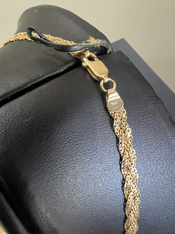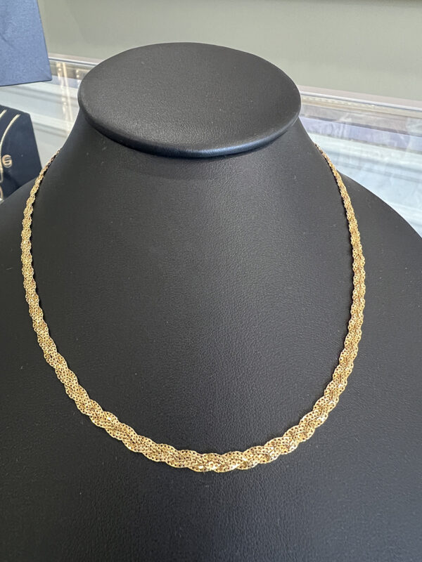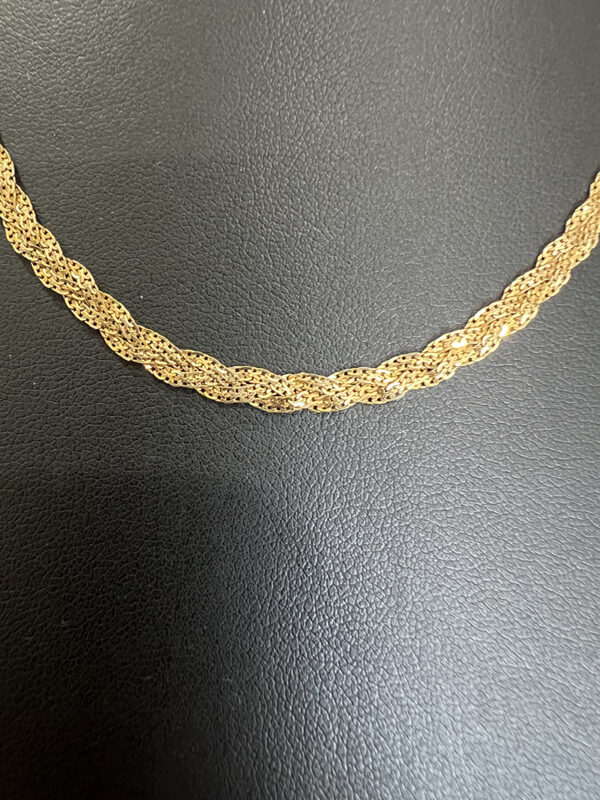 Elegant and timeless, this 18K gold braided chain necklace is a pre-loved piece in beautiful new condition. Featuring a gorgeous sparkling braided design, the chain reflects light beautifully and offers a rich, luxurious shine that makes it perfect for both everyday wear and special occasions.