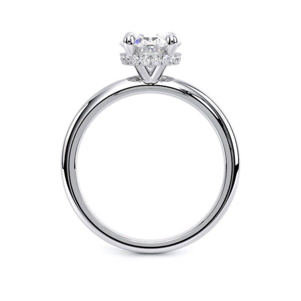 Crafted with precision and balance, this oval lab diamond hidden halo engagement ring is designed so a wedding band can sit flush against it. The crown-style under halo elevates the centre stone while subtly reflecting light from every angle, creating a luxurious yet understated glow.