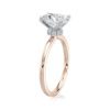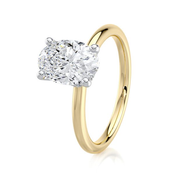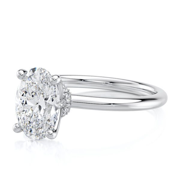 This elegant and modern oval hidden halo engagement ring features a glamorous halo under the setting, adding that extra touch of sparkle. Designed for timeless elegance, this ring allows a wedding band to sit flush against it, creating a seamless and sophisticated look.