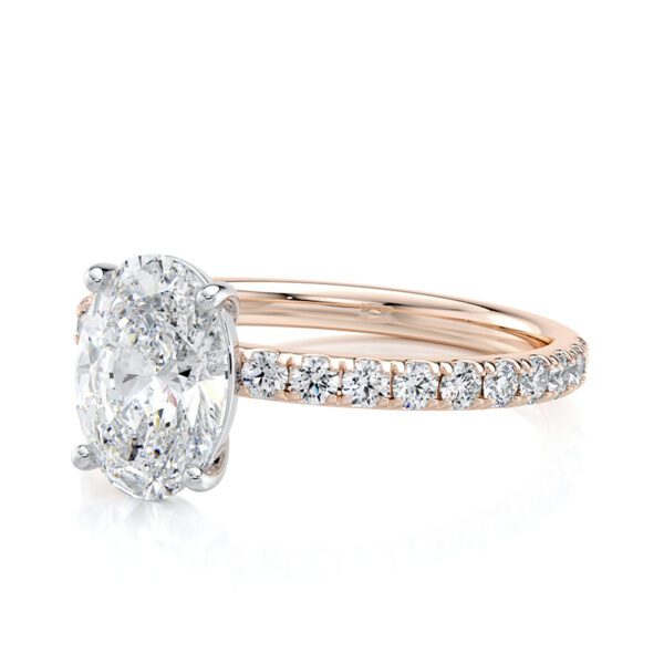 - Design: Oval lab diamond engagement ring with basket pavé band