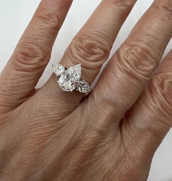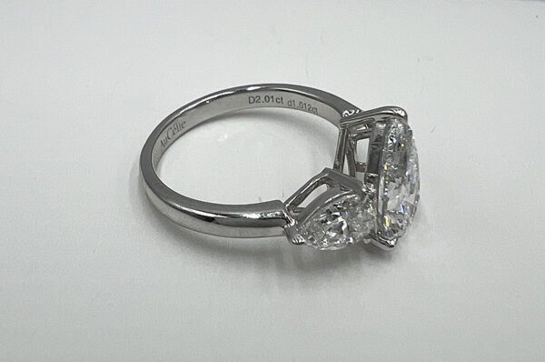 - Center Diamond: 2.01 CT Pear Cut Lab-Created Diamond, D color, VS1 clarity, IGI Certified (Report: LG707513665)